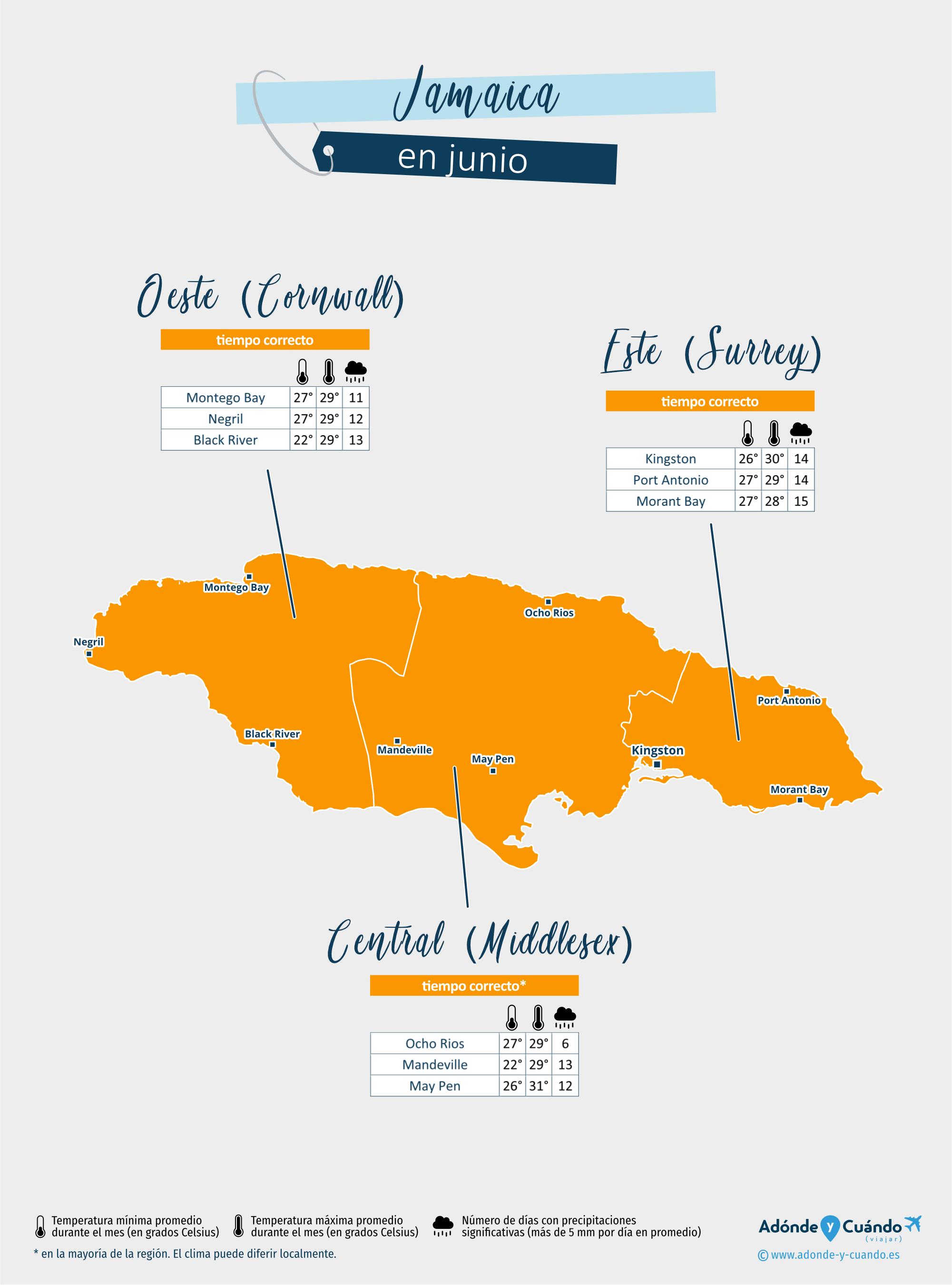 El clima de Jamaica en junio varía de bueno a correcto dependiendo de la región y ciudad.
